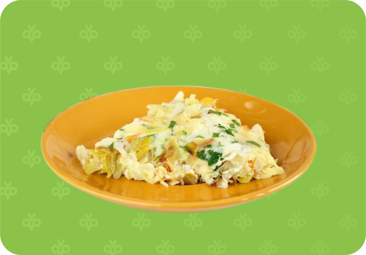 - Поверхность залить яичной смесью и слегка всё перемешать, чтобы равномерно пропитать капусту яйцом.